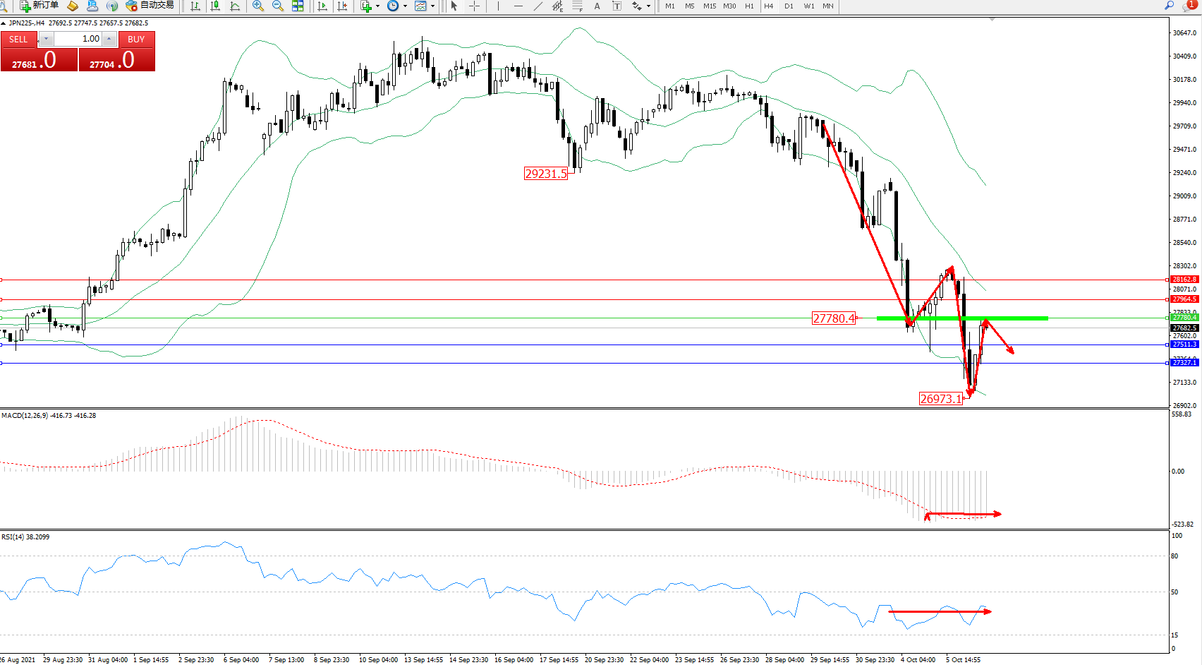 技术点评:空头动力延续布林带指标通道中下轨区间维持阶梯式震荡下行,低位抵达26973位置后得到支撑短期反转上移,但下行趋势态势良好,依旧有进一步向下移动态势,布林带指标呈缓慢张口不断向下移动中,MACD指标处于空头区域维持整理平移,RSI指标处于空头区域维持剧烈震荡中;