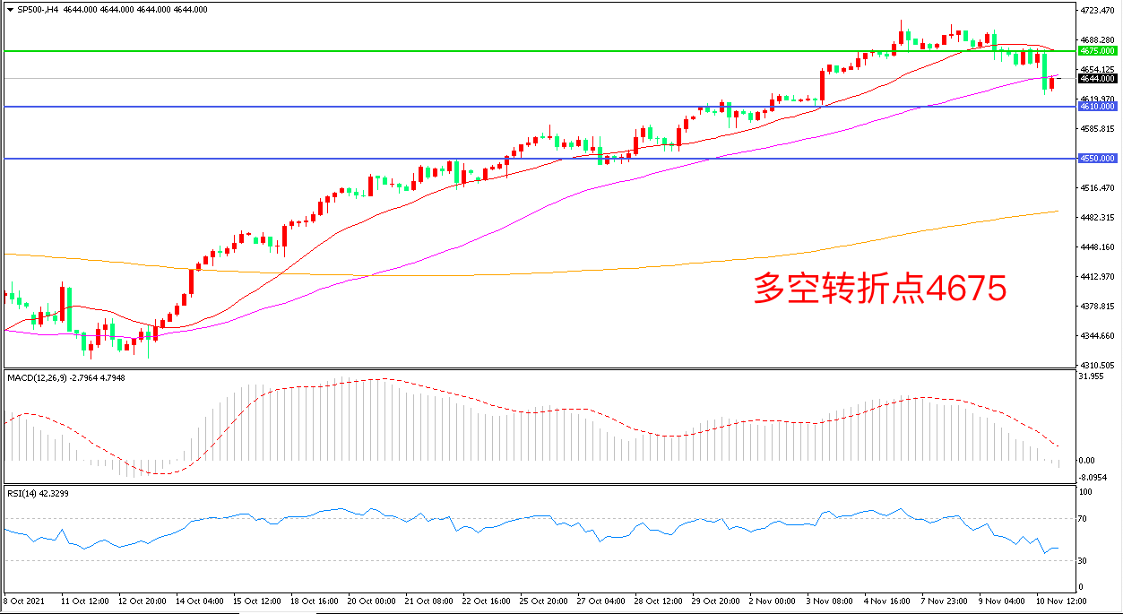 周三(11月10日),美国10月CPI和核心CPI增速均超出市场预期,创三十年最高同比增速,凸显通胀爆表形势,投资者对冲通胀风险,抛售高成长科技股、亚马逊、谷歌和Facebook均跌超2%,标普500破位大跌,收报4644点。二季度触及高点后,2022年标普500 盈利增速预计将从今年的44.6%大幅放缓至8.4%,在盈利增速和流动性投放都将阶梯型回落的背景下,美股市场的拐点可能会再次到来。