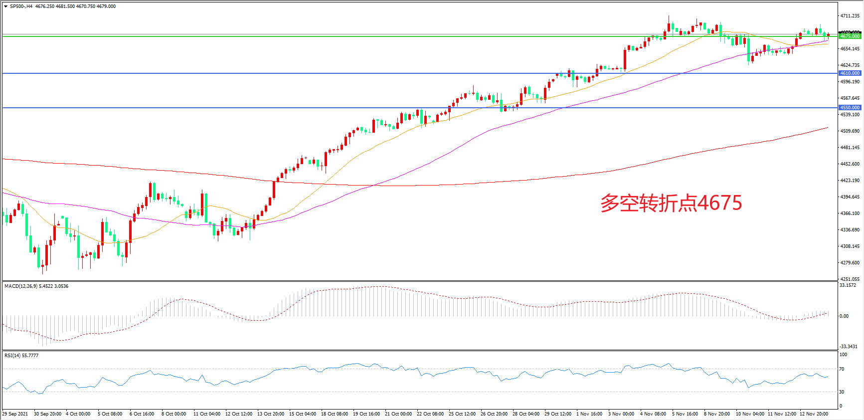 4小时图看,标普500围绕着4675一线窄幅波动,短期走势陷入分歧,均线系统粘合形成支撑,MACD红柱增加,RSI指标走平,日内震荡上行概率较大。