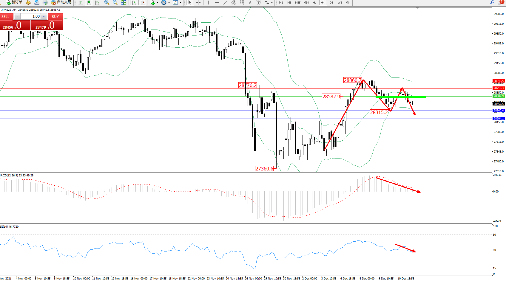 技术点评:低位多头动力延续布林带指标上轨附近持续震荡上扬,高位抵达28860位置后遇阻整理回撤,纠结于布林带指标通道中下轨区间震荡,短期空头动力有继续维持整理走势,布林带指标呈收口走势徘徊有向下移动迹象,MACD指标处于多头区域维持整理缓慢下行后即将触及0轴线附近节点,RSI指标纠结于50均衡线附近喘息震荡中;