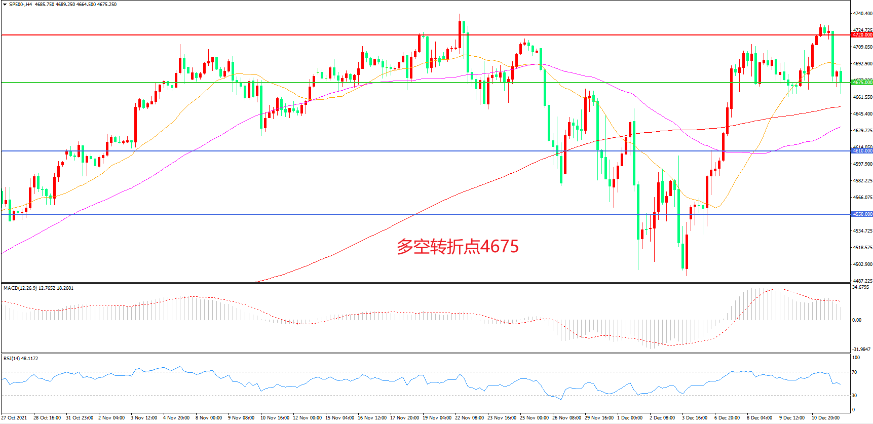 4小时图看,标普500触碰4720后大幅回落,短期走势出现调整,均线系统走平,4675成为多空分水岭,MACD红柱缩短,日内延续震荡概率较大。