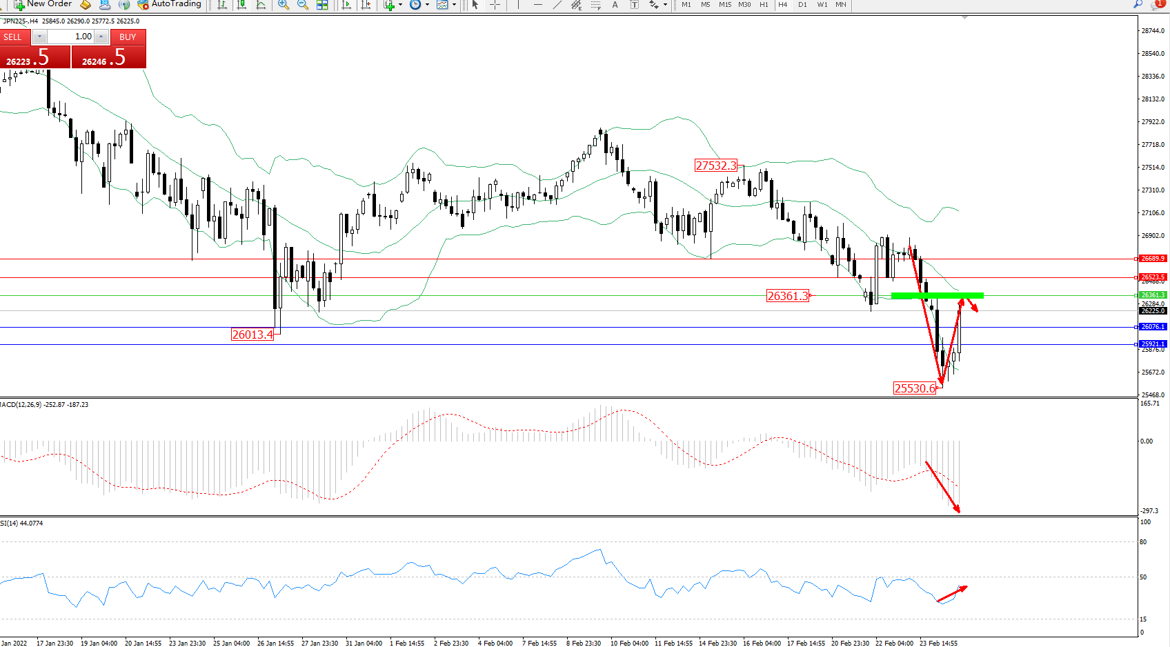 日经225指数2月24日(周四)收盘下跌469.61点,跌幅1.78%,报25980.00点。日本首相岸田文雄在参议院预算委员会会议上表示,针对俄罗斯承认乌克兰东部两个地区“独立”等问题,如果未来局势进一步恶化,日本必须迅速与国际社会合作采取进一步措施。日本将于下午3点举行国家安全委员会会议。以应对俄罗斯在顿巴斯开始的特别军事行动。