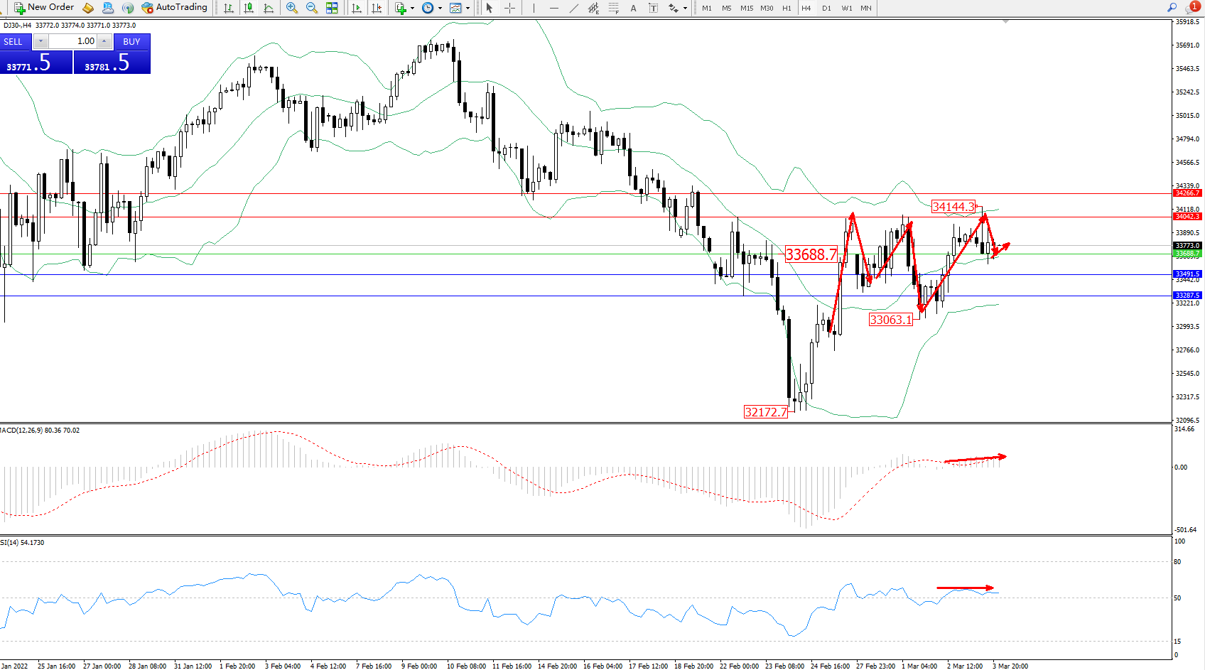 道琼斯指数3月3日(周四)收盘下跌96.13点,跌幅0.28%,报33795.22点;美股高开低收,道指初步收跌,俄乌冲突导致的食品和油价上涨,可能推动美国通胀率升至1981年以来的最高水平。根据以Sarah House为首的富国银行经济学家发布的研究报告,如果油价保持在100美元/桶以上、商品研究局食品指数较去年底上升35%,将使今年的CPI指数上升1.3个百分点 。根据彭博对经济学家的调查,2022年美国CPI平均同比升幅料为5.1%,高于去年的4.7%。