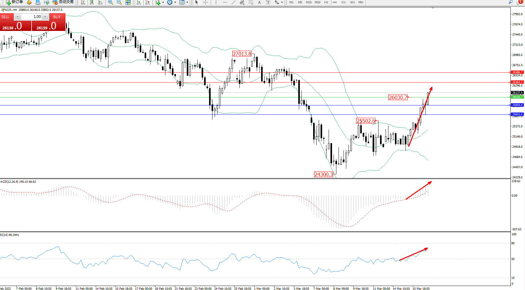 日经225指数3月16日(周三)收盘上涨414.02点,涨幅1.63%,报25760.50点。日本3月制造业信心三个月来首次改善,汽车业悲观程度减轻,但企业担心乌克兰危机带来新一波能源价格飙升。服务业信心自10月以来首次转为负值,因防疫限制及全球通胀压缩企业获利。制造业信心连续第14个月维持正值,但多项下行风险令日本经济前景蒙阴,企业经理人对此感到担忧。