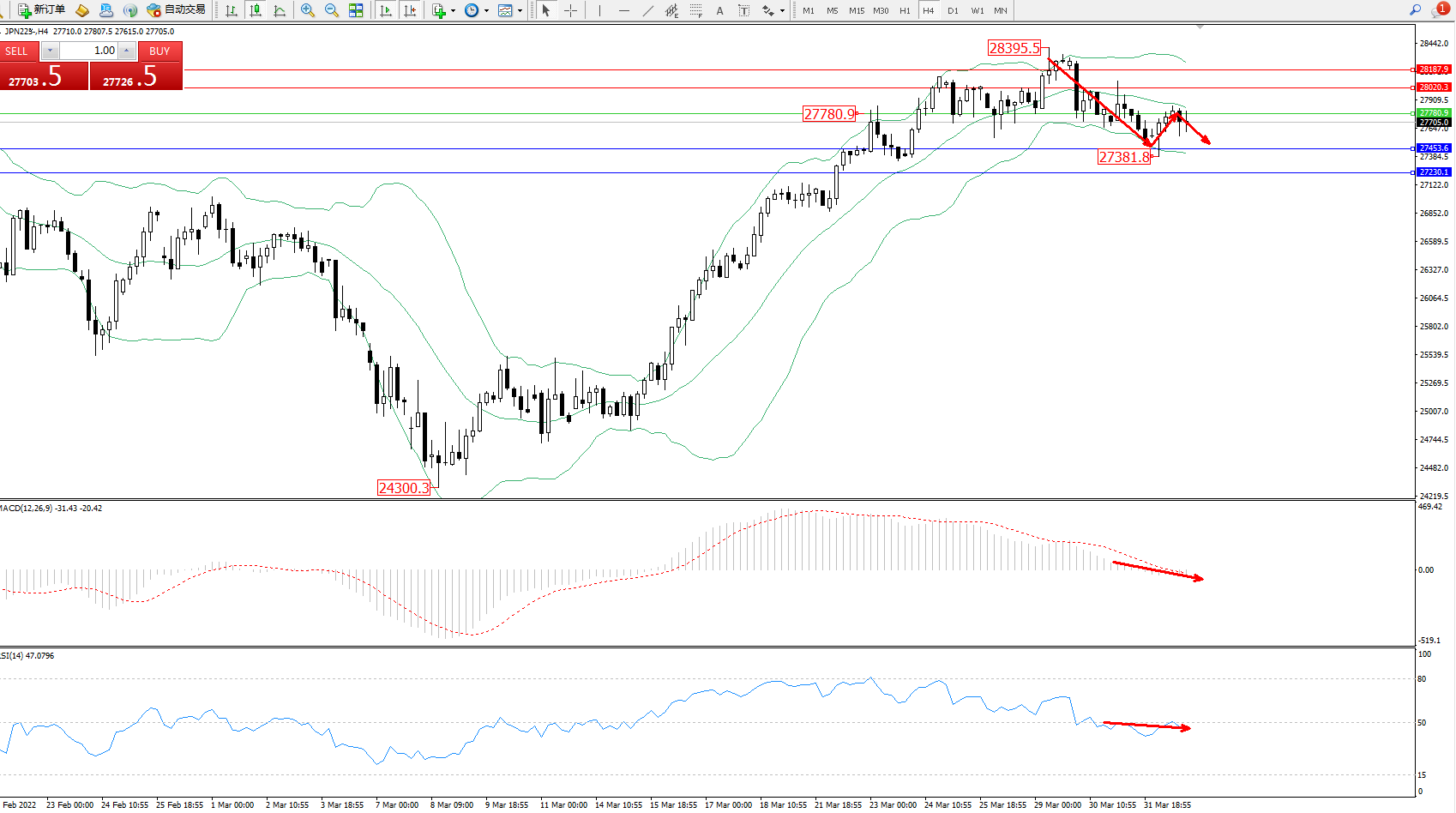 技术点评:高位空头动力维持在布林带指标通道中下轨区间持续震荡向下移动,短期抵达27381位置节点短暂回升后再度向下移动,布林点指标呈缓慢张口走势后开始收口,MACD指标空头动力维持震荡下行至0轴线附近弱势徘徊中,RSI指标处于50均衡线下侧弱势整理中;