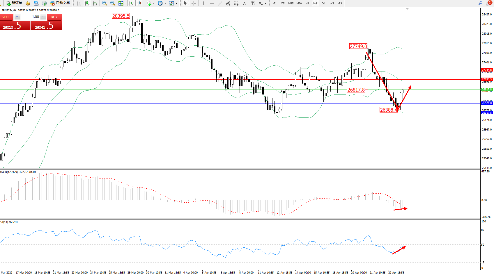 技术点评:空头动力延续布林带指标下轨附近持续震荡下挫,低位抵达26388附近节点后得到支撑反转上移,短期多头动力有伺机反攻上移态势,布林带指标张口走势后开始有收口迹象,MACD指标处于空头区域维持整理平移,RSI指标处于空头区域维持震荡上移,