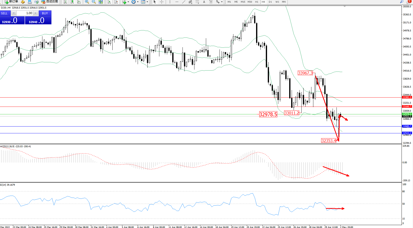 技术点评:空头动力延续布林带指标下轨附近强势下挫,低位跌破下轨至32353附近节点后快速拉升,短期空头弱势或将延续,布林带指标呈张口走势态势良好,MACD指标处于0轴线下方弱势震荡下行,RSI指标处于50均衡线下侧弱势徘徊中;