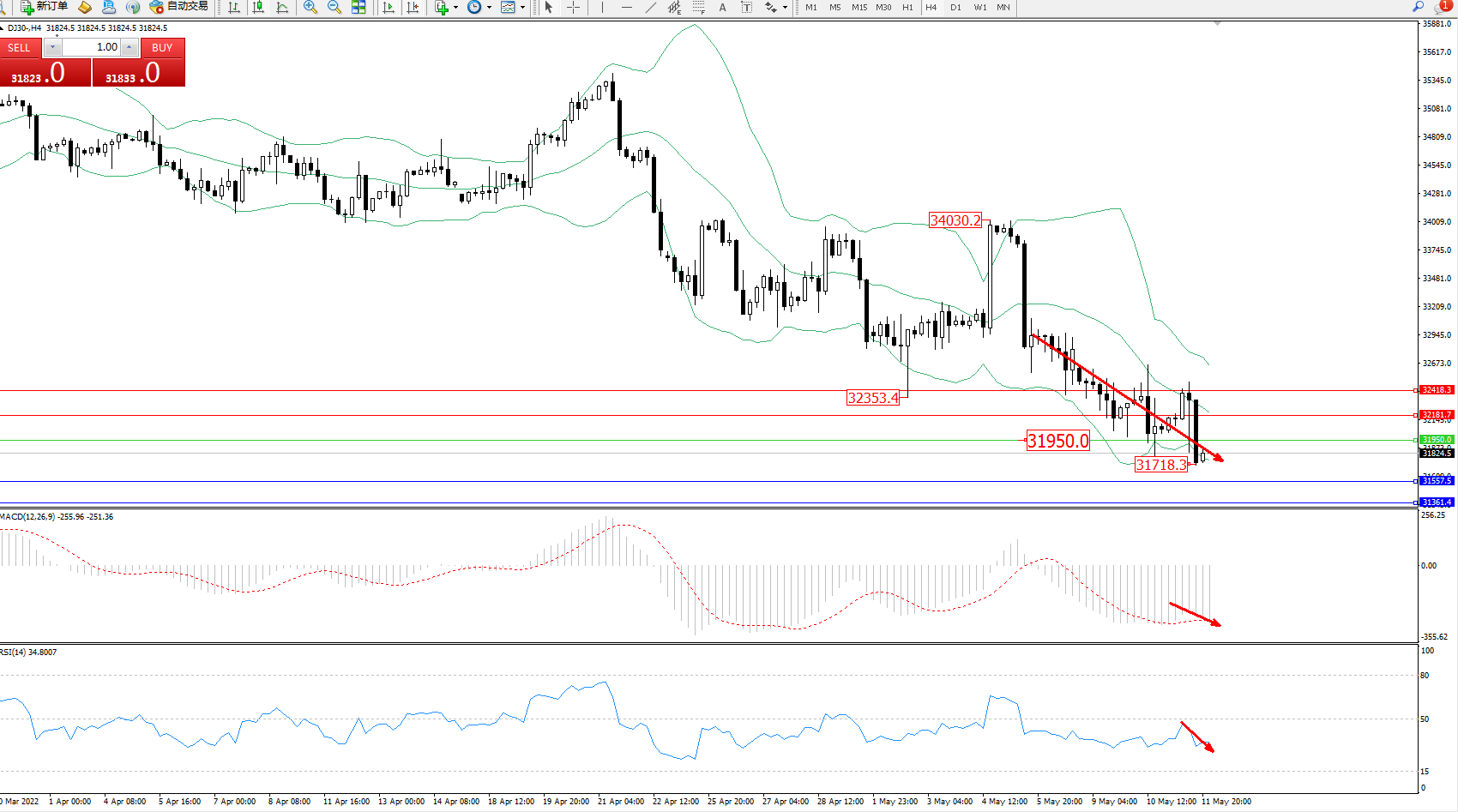 技术点评:空头动力延续布林带指标通道中下轨区间持续震荡下行,低位抵达31718附近节点后开始宽幅震荡,短期空头动力有继续下行态势,布林带指标呈收口走势不断向下移动,MACD指标处于空头区域维持整理平移,RSI指标处于空头区域维持弱势震荡中;