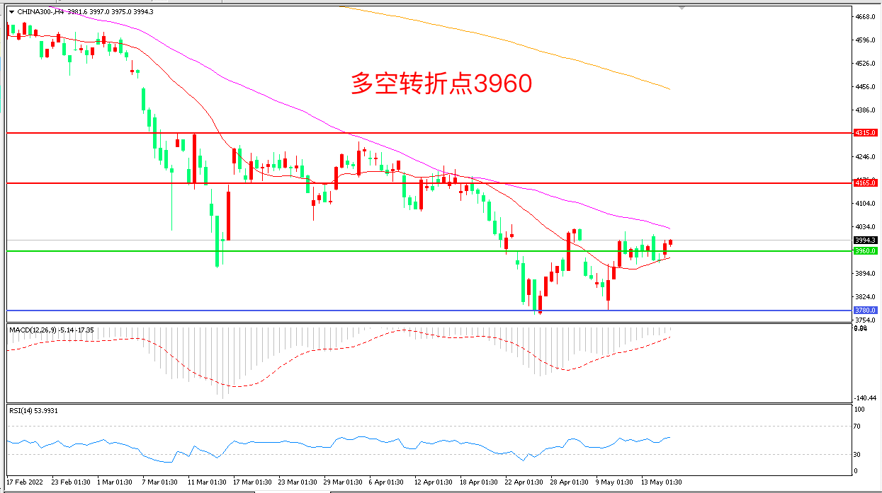4小时图看,沪深300受阻于55均线后延续横盘震荡形态,多空博弈胶着,均线系统走平,3960成为多空分水岭,MACD绿柱缩短,RSI指标走平,日内小幅反弹概率较大。