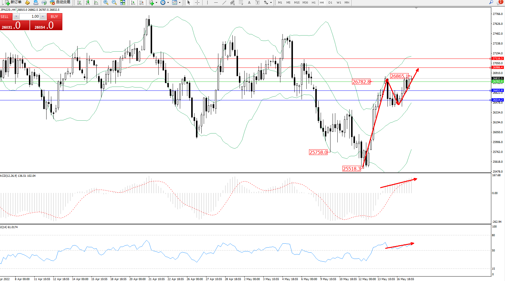 日经225指数5月17日(周二)收盘上涨121.45点,涨幅0.46%,报26668.50点。日本央行政策的目标是实现2%的物价目标,不是为了控制汇率;日本财务大臣铃木俊一表示,政府必须防止滞胀,将与日本央行合作以摆脱通货紧缩,预计日本央行将根据2013年与政府达成的协议,适当调整政策,以达到2%的通胀目标;日本宣布将于本月试行接纳部分国家小规模旅行团。