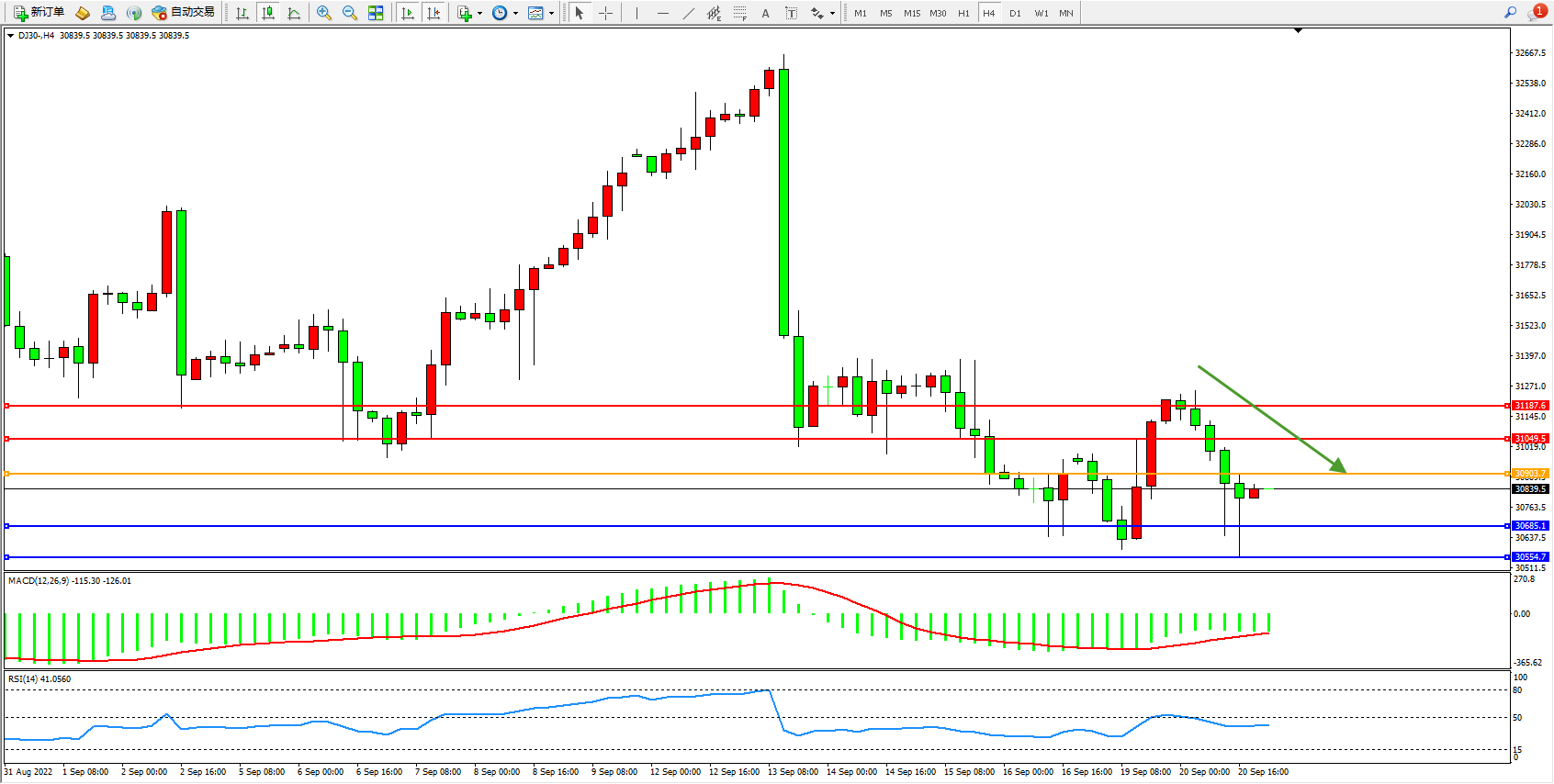 道琼斯指数9月20日(周二)收盘下跌312.60点,跌幅1.01%,报30707.08点;在美国8月份通胀数据显示物价持续上涨后,软着陆的可能性大幅下降。即使假设在没有适当衰退的情况下仍有可能降低通胀,经济数据及其引发的反应还大大增加了美联储过度加息的风险,政策利率最终可能高达5.00%,无论如何会导致经济衰退。