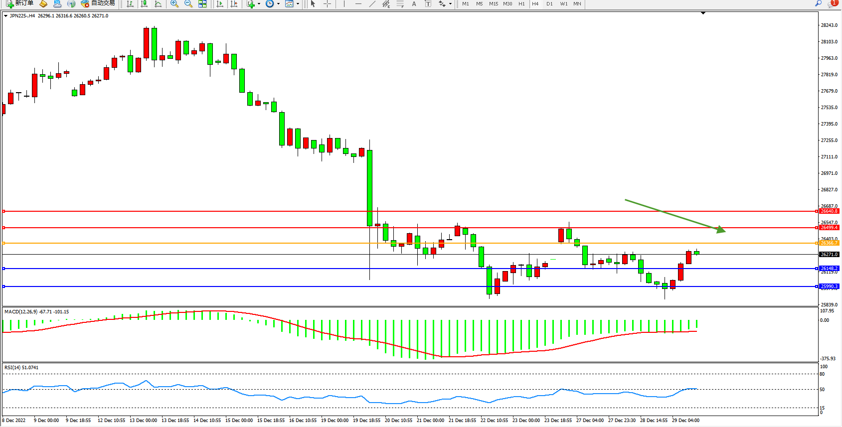 日经225指数12月29日(周四)收盘下跌297.50点,跌幅1.13%,报26043.00点。日央行应通过购买日本国债来维持当前的宽松政策立场,债券市场的功能恶化,如果这种情况持续下去,可能会对公司债券发行条件等金融状况产生负面影响,并阻碍货币宽松效应的传导。