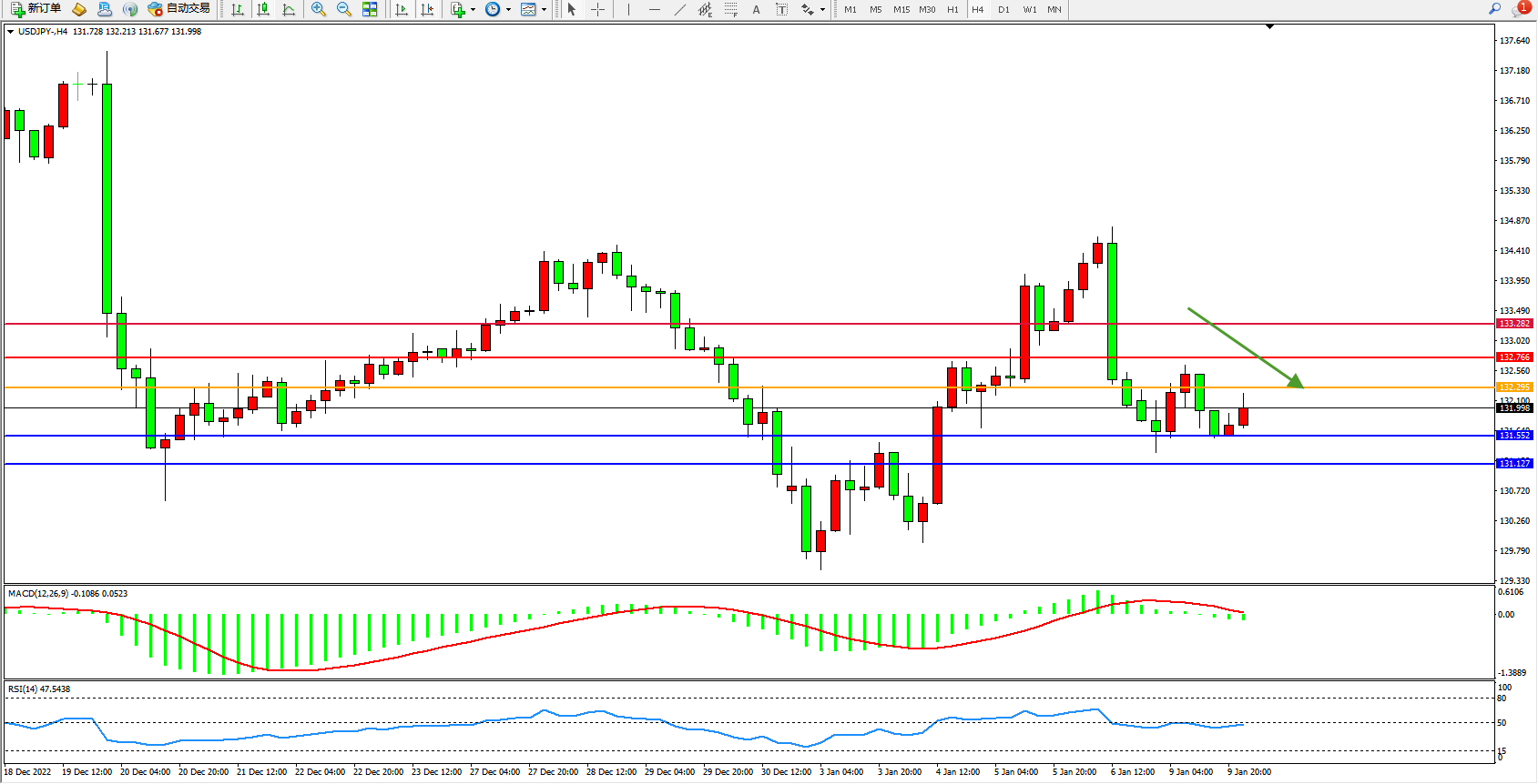 备选策略:132.295上方看涨,目标132.766、133.282