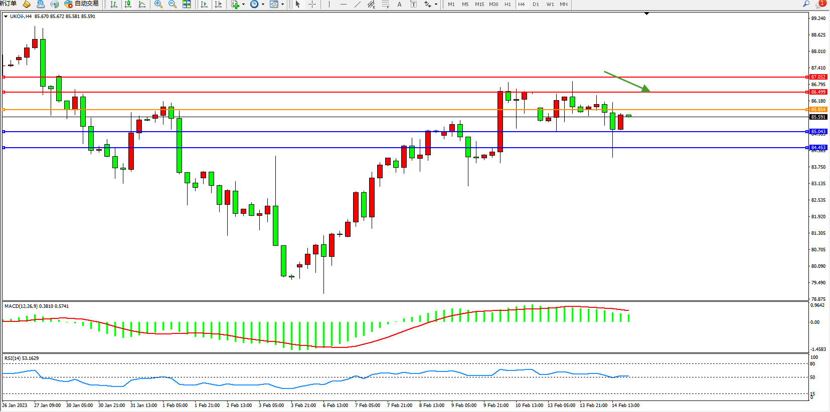 4小时图看:高位空头动力维持窄幅整理缓慢下行,市场空头情绪持续,短期有继续下移迹象,MACD指标处于多头区域维持整理下行,RSI指标处于50均衡线附近弱势徘徊;