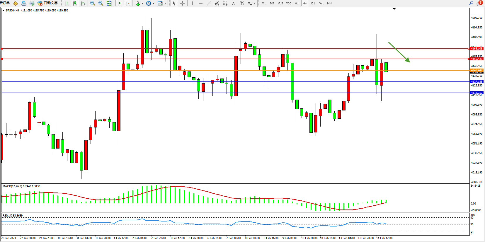 标普500指数2月14日(周二)收盘下跌1.73点,跌幅0.04%,报4135.56点;美国1月未季调CPI年率 6.4%,预期6.20%,前值6.50%,为连续第7个月下降,创2021年10以来最小增幅。美国1月季调后CPI月率 0.5%,预期0.50%,前值-0.10%,创2022年6以来最大增幅。