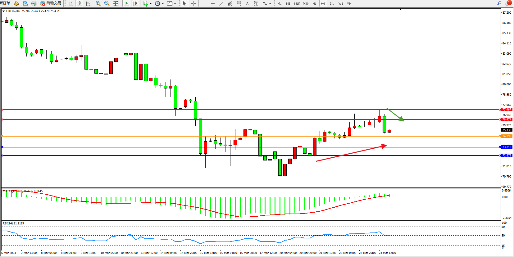 4小时图看:多头动力持续震荡上扬,短期看涨情绪遇阻震荡,市场多头动力上行短期遇阻震荡,MACD指标处于0轴线上側徘徊,RSI指标处于50均衡线附近弱势整理;