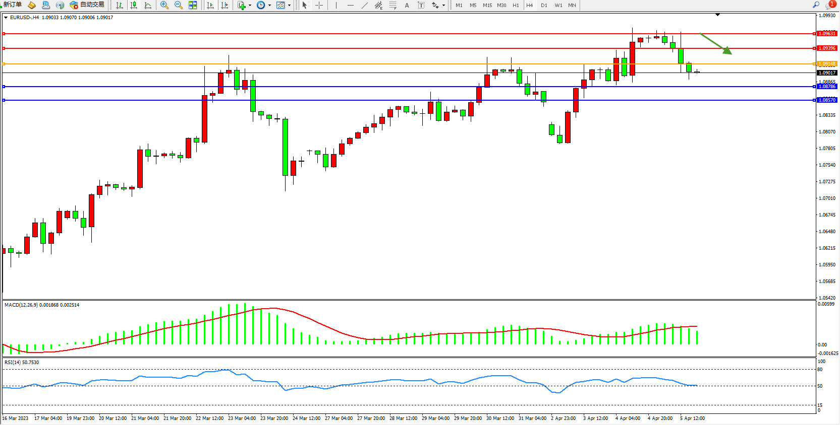4小时图看:高位空头动力震荡下移,短期跌势或将持续,市场整体处于高位偏空头走势中,MACD指标处于多头区域震荡,RSI指标维持震荡下移至0轴线附近徘徊;