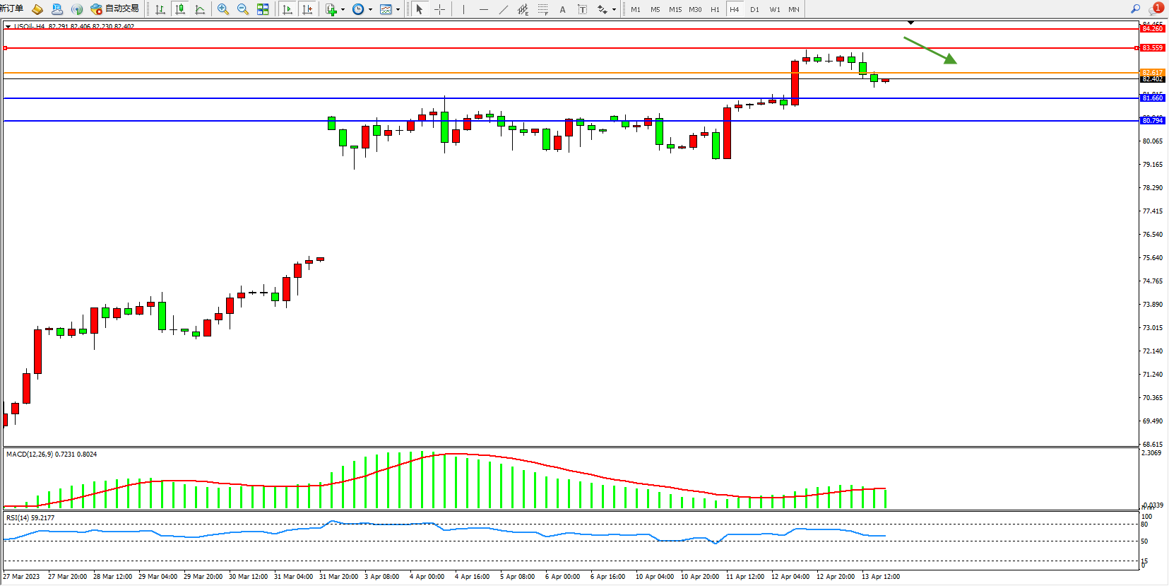 4小时图看:高位短期窄幅整理后空头动力伺机入场,短期有震荡下行迹象,MACD指标处于多头区域整理,RSI指标处于50均衡线上側徘徊;