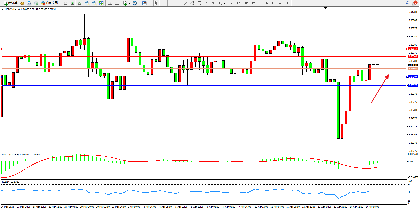 美元人民币USDCNH——4小时K线图显示: