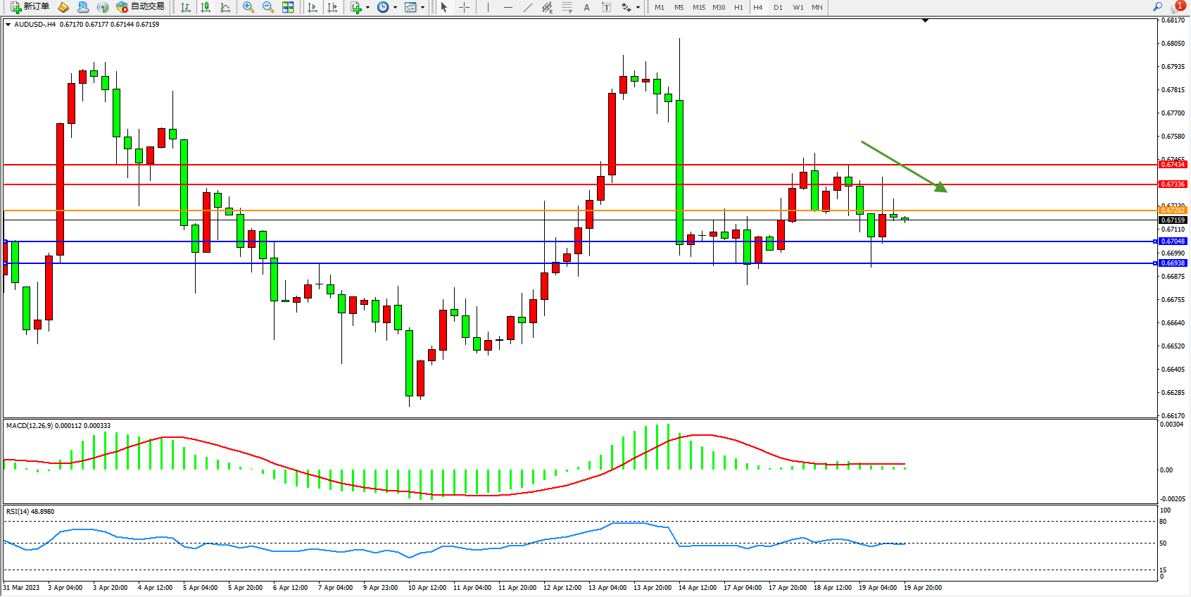 交易策略:0.67202下方看跌,目标0.67048  0.66938