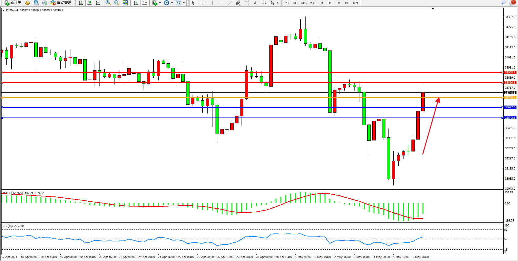 道琼斯指数5月5日(周五)收盘上涨546.57点,涨幅1.65%,报33674.31点;美国4月失业率 3.4%,预期3.60%,前值3.50%。美国4月季调后非农就业人口 25.3万人,预期18万人,前值23.6万人。