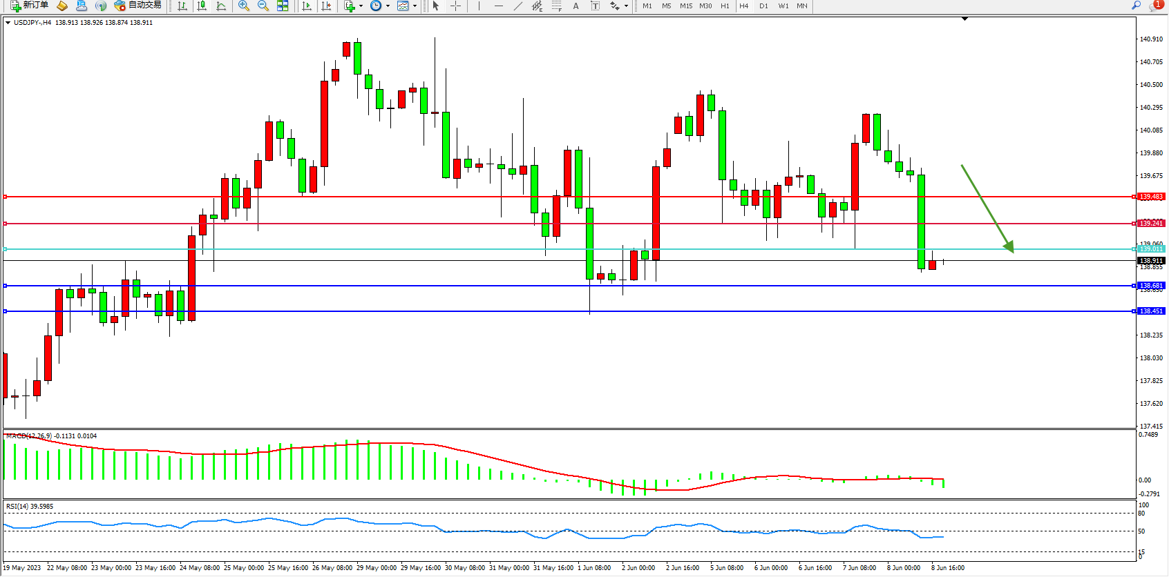 4小时图看:空头动力急速下挫,短期跌势或将延续,市场整体不断震荡下行,MACD指标处于0轴线下侧弱势徘徊,RSI指标处于50均衡线下侧弱势整理;