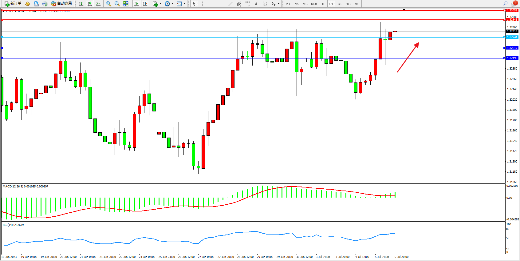 4小时图看:多头动力高位震荡上扬。短期看涨情绪笼罩,市场多头不断攀升中,MACD指标处于多头区域维持整理,RSI指标处于50均衡线上側弱势徘徊;