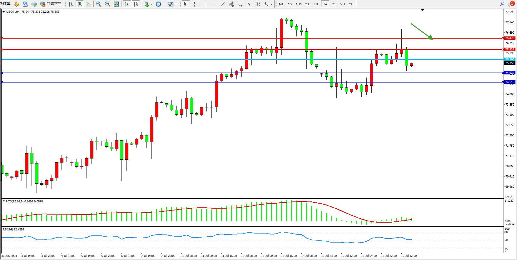 原油维持75.353附近震荡,美国至7月14日当周EIA原油库存 -70.8万桶,预期-244万桶,前值594.6万桶。俄克拉荷马州库欣原油库存 -289.1万桶,前值-160.5万桶。