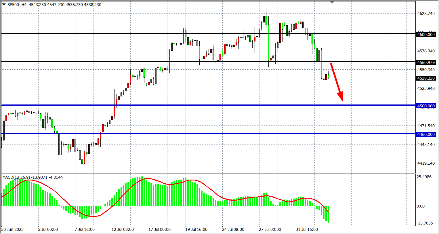 4小时图看,标普高位回落跌破支撑4560,MACD量能下穿零轴,短线走势偏空,阻力关注4560-4600附近,下方支撑4500-4460。