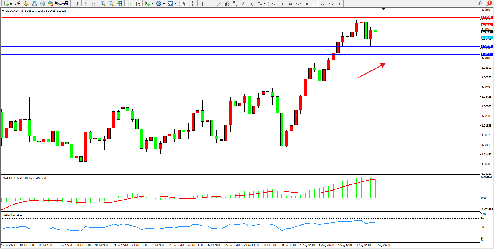 4小时图看:多头动力持续震荡上扬后整理,短期看涨情绪笼罩,市场多头不断上行中,MACD指标处于多头区域高位整理,RSI指标处于多头区域维持徘徊;