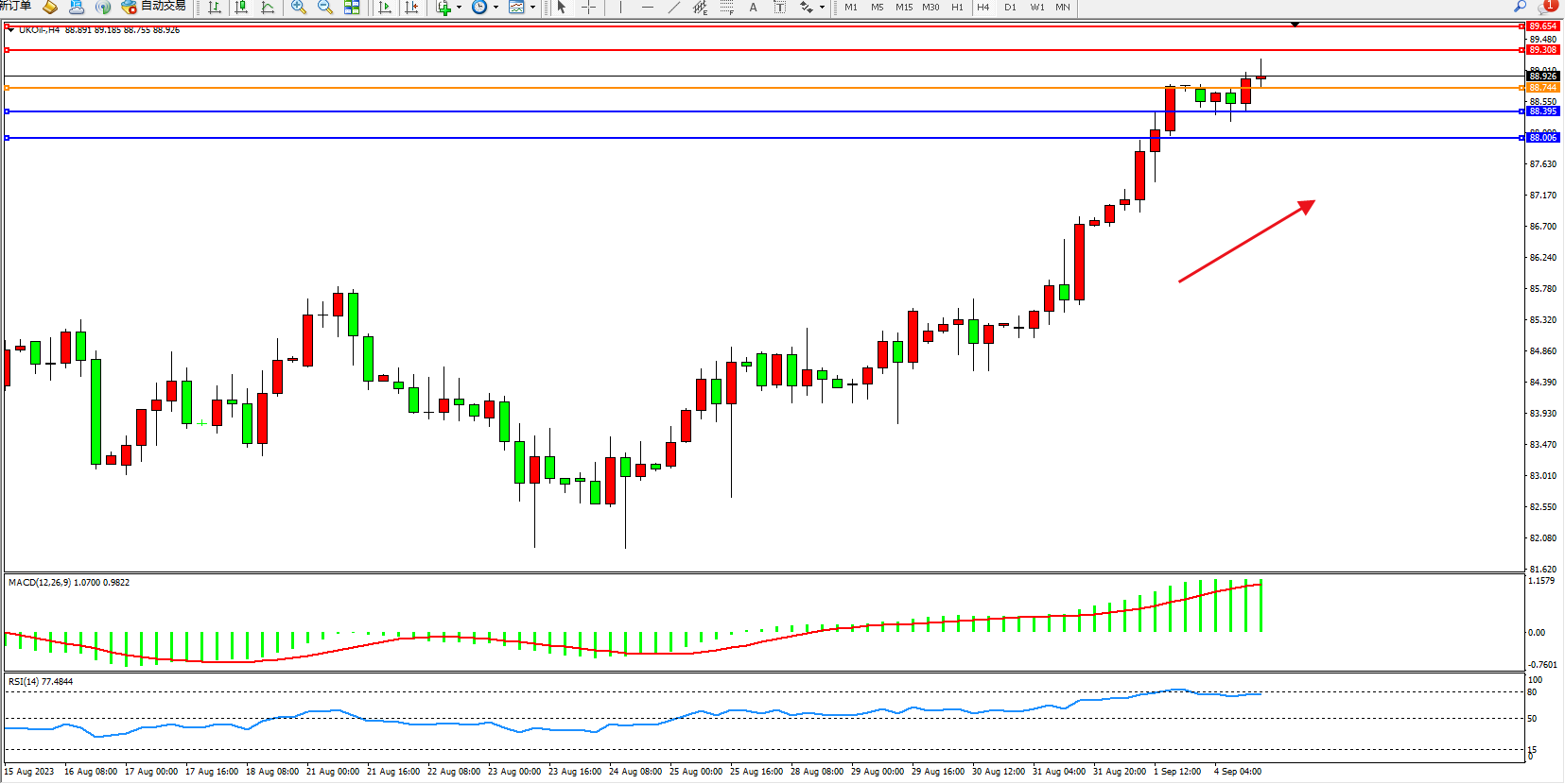 布油维持88.926附近震荡,在布伦特原油市场,油价上涨已突破近期峰值,表明即将迈向90美元水平,欧佩克的影响以及看涨旗帜等技术指标给市场轨迹增添了层次的复杂性。无论选择逢低买入还是预期进一步上涨,紧跟市场发展对于抓住潜在机会都至关重要。