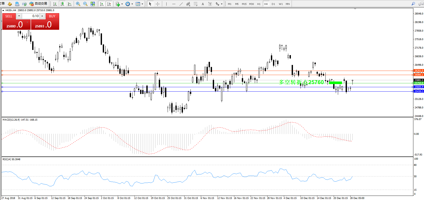 恒指HK50 ——4小时K线图显示: