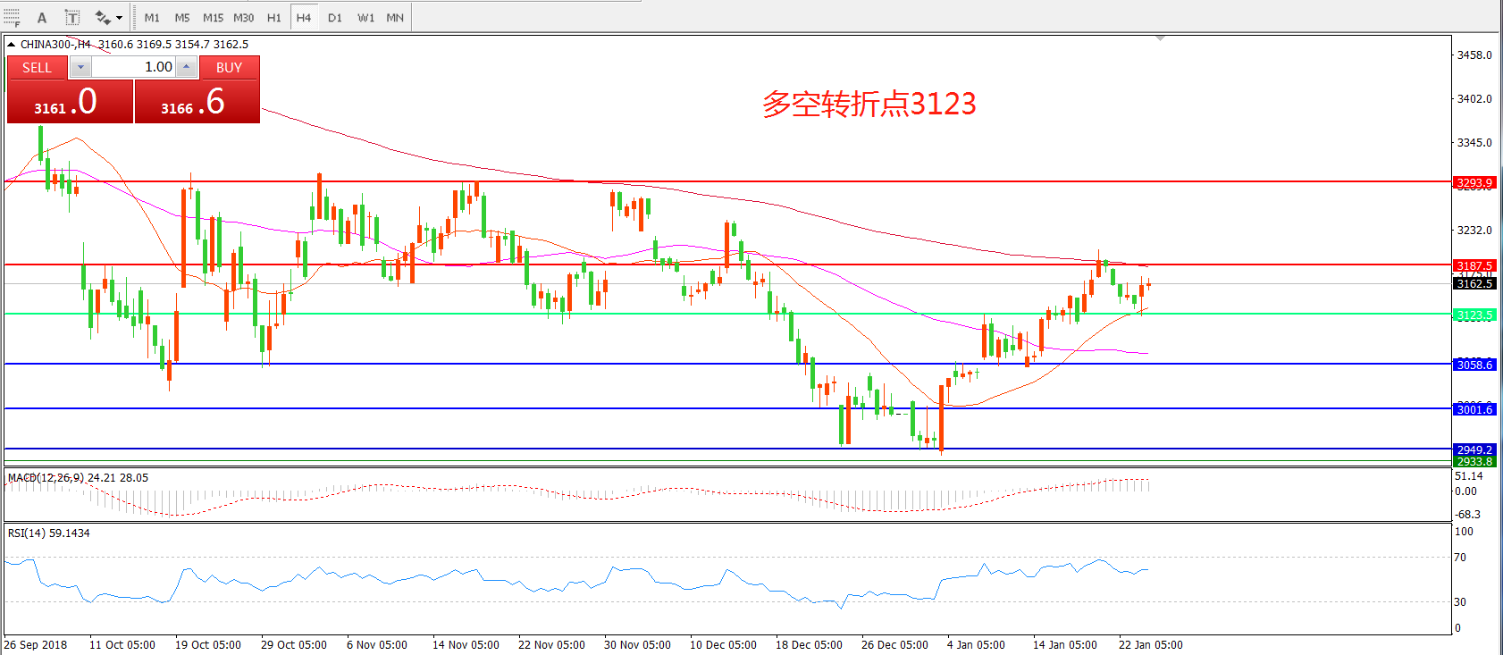 4小时图看,CHINA300中华指数站稳3058后陷入整理,冲击3187.5一线阻力如期回落, MACD红柱增加,短期反弹仍有可能。