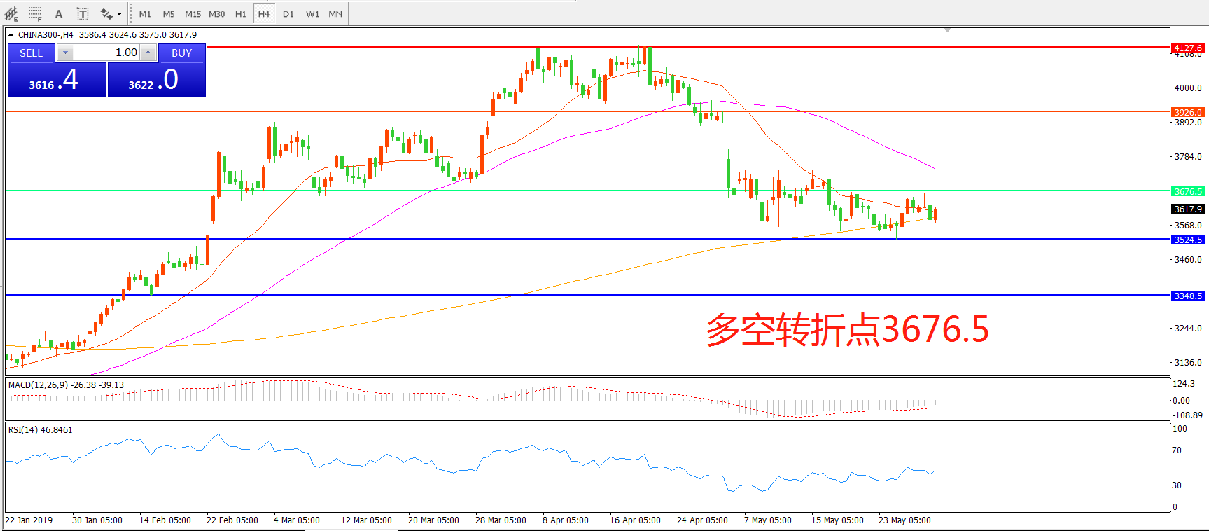 4小时图看,沪深300指数在跌破3676.5后陷入震荡走势,振幅逐渐收窄, 200均线成为短期支撑,MACD绿柱缩短,RSI指标拐头向下,日内以震荡下行思路对待。