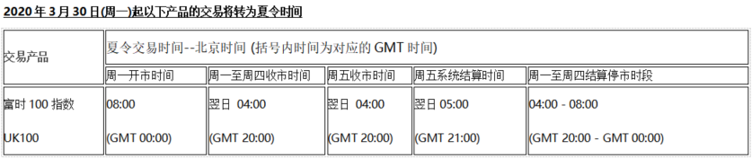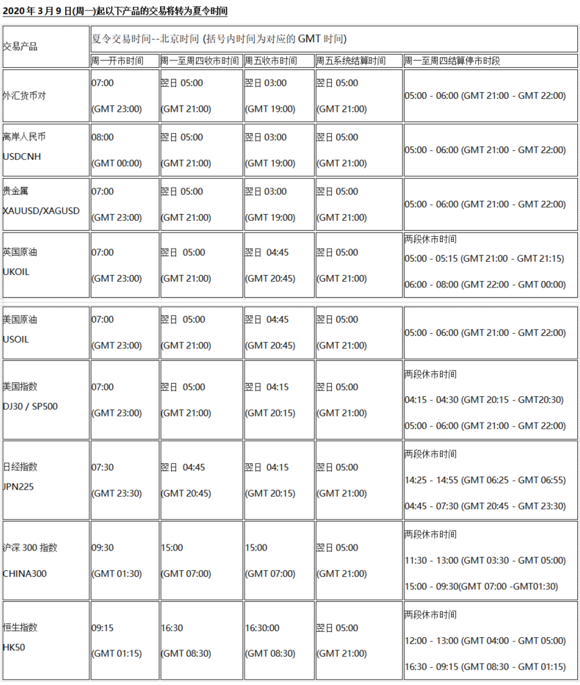 因应北美时区将于2020年3月8日(周日)以及欧洲时区将于2020年3月29日(周日)分别开始转为夏令时间, 欧美市场各产品的交易将调整为夏令时交易时间,敬请留意!