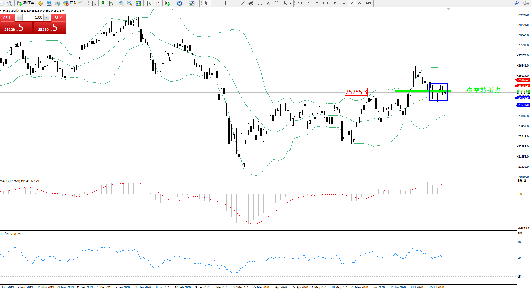 技术点评:低位多头动力强势冲高回撤后,处于布林带指标中轨附近呈矩形窄幅震荡已有数日之久,多空动力尚欠缺方向指引,布林带指标呈收口走势后有开始平移态势,关注中轨附近多空转折点,市场依旧需要该位附近给出最佳方向抉择,MACD指标高位空头动力弱势震荡缓慢下移中,RSI指标空头动力弱势震荡回撤至50均衡线后维持数日该位附近持续整理平移中;