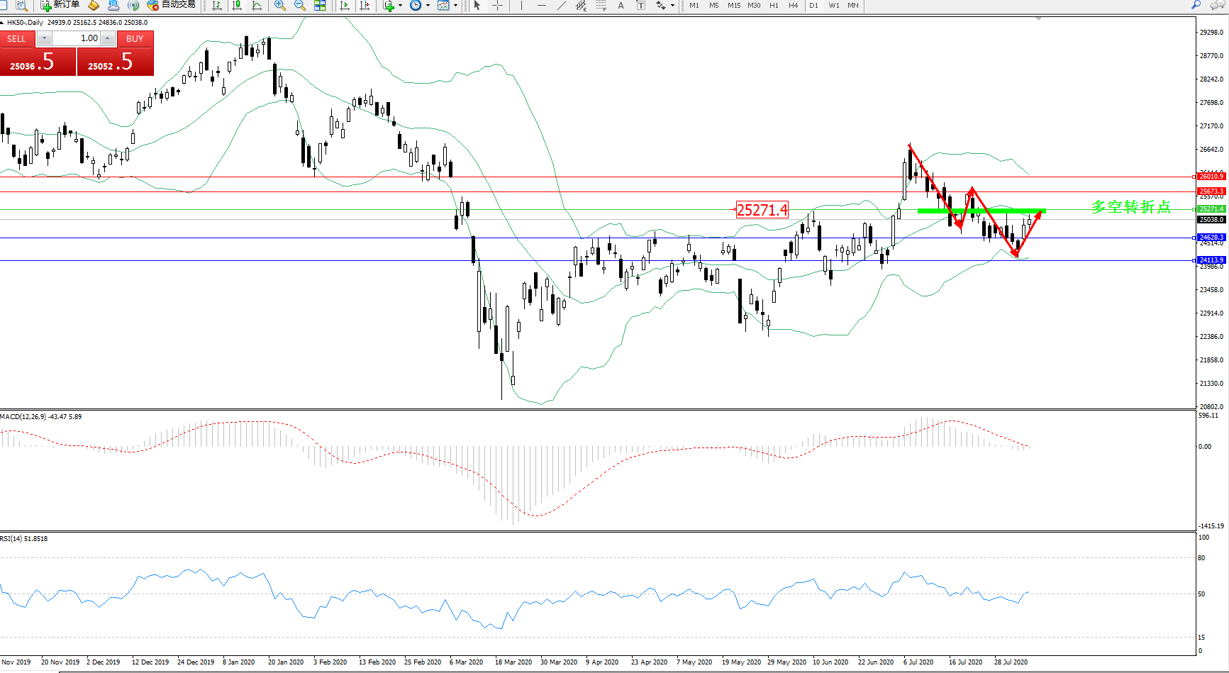香港恒生指数8月5日(周三)收盘上涨155.91点,涨幅0.62%,报25102.54点;港股三大指数收涨,医疗设备股、生物医药股涨幅居前,维亚生物飙涨超19%,春立医疗大涨10%;阿里概念股、中资券商股、濠赌股走低明显。恒指成份股中,舜宇、港交所均升2.4%,腾讯收涨2%。今日南下资金净流入23.84亿港元,大市成交额为1228亿港元。 港股通今日净买入美团点评(3690.HK)8.58亿港元(连续7日累计净买入45.85亿港元),腾讯(0700.HK)3.08亿港元,思摩尔(6969.HK)3.02亿港元(连续8日累计净买入49.92亿港元);净卖出中芯国际(0981.HK)9.13亿港元,中生制药(1177.HK)4.05亿港元。此前因疫苗冷链概念炒作走出7连板的英特集团(000411.SZ)在昨天打开涨停板后,今天早盘以跌停开盘,但随着整个医药体系类股集体走高,该股半小时不到跌停板被打开,之后一路震荡向上一度涨超8%,振幅高达18.29%,目前涨幅为1.6%。