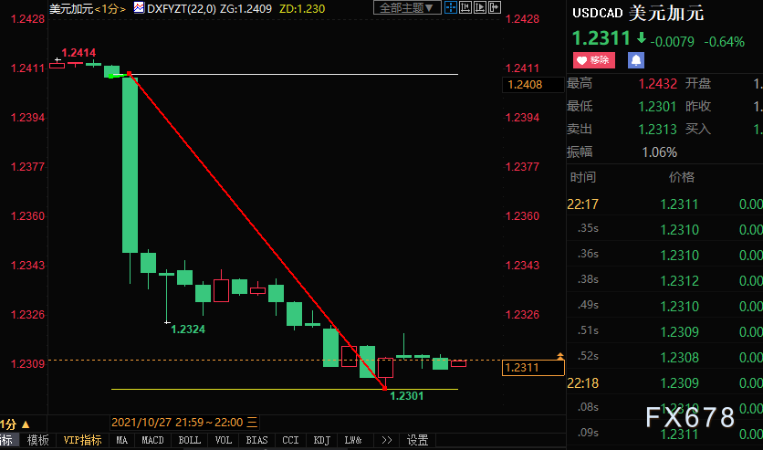 北京时间周三(10月27日)22:00,加拿大央行结束量化宽松,转在投资,并提升预期加息步伐。截至发稿,美元兑加元(1.2373, 0.0013, 0.11%)重挫近110个点至1.2301。