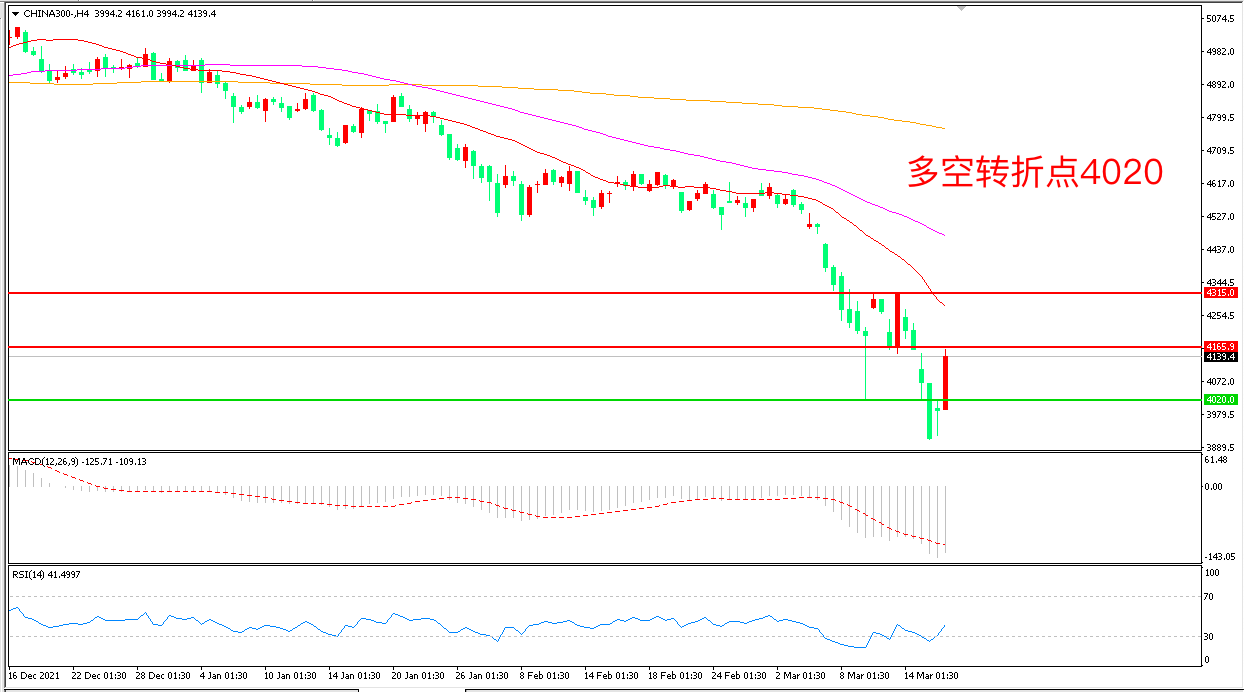 4小时图看,沪深300 长阳拉升,短期跌势有所缓解,但均线系统呈空头排列, MACD绿柱缩短,RSI指标走平,日内小幅反弹概率较大。