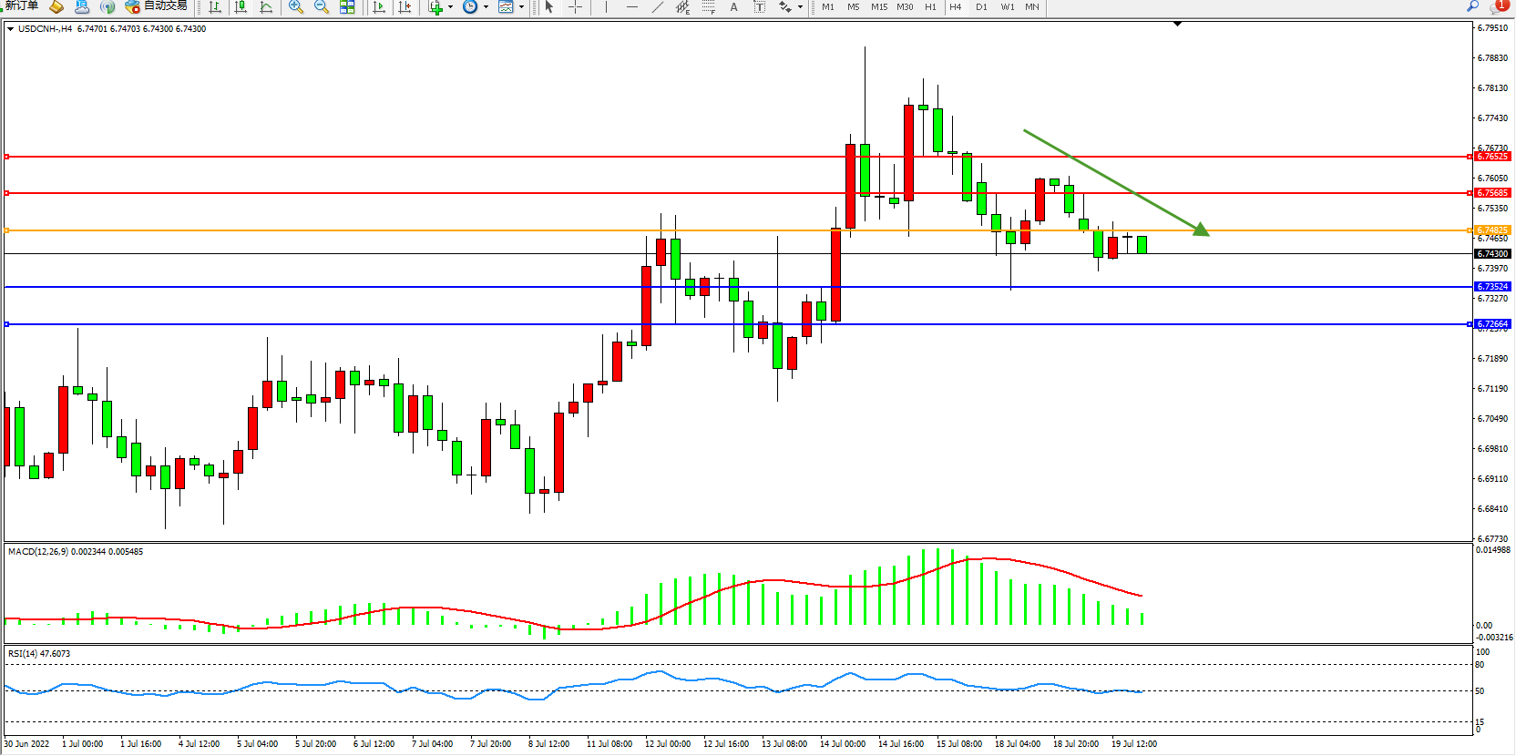 美元人民币USDCNH——4小时K线图显示: