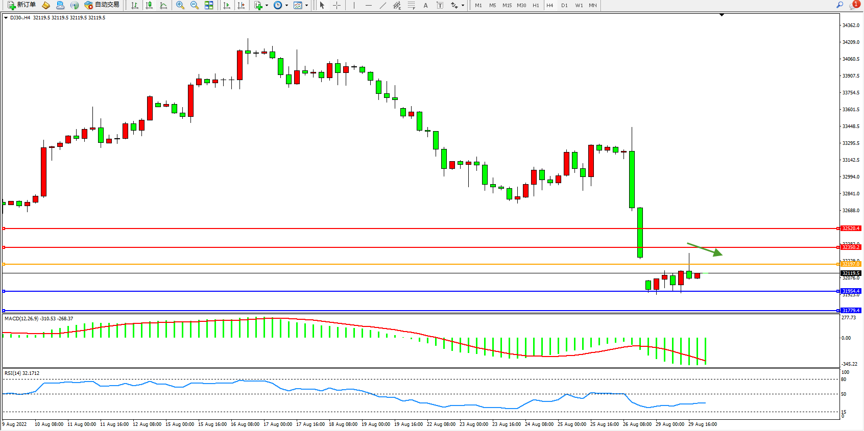 道琼斯指数8月29日(周一)收盘下跌183.75点,跌幅0.57%,报32099.65点;鲍威尔的言论支持在更长时期内联邦基金利率抬升预期。美联储2023年年中开始降息预期还为时过早。