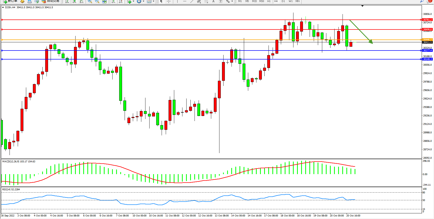 道琼斯指数10月20日(周四)收盘下跌90.69点,跌幅0.30%,报30333.12点;随着美联储加大货币政策收紧力度,就业市场开始出现裂痕,美联储已将政策利率上调至3.00%-3.25%的区间,官员们已暗示今年还会有更多的大幅加息,目前通胀几乎没有大幅回落的迹象。