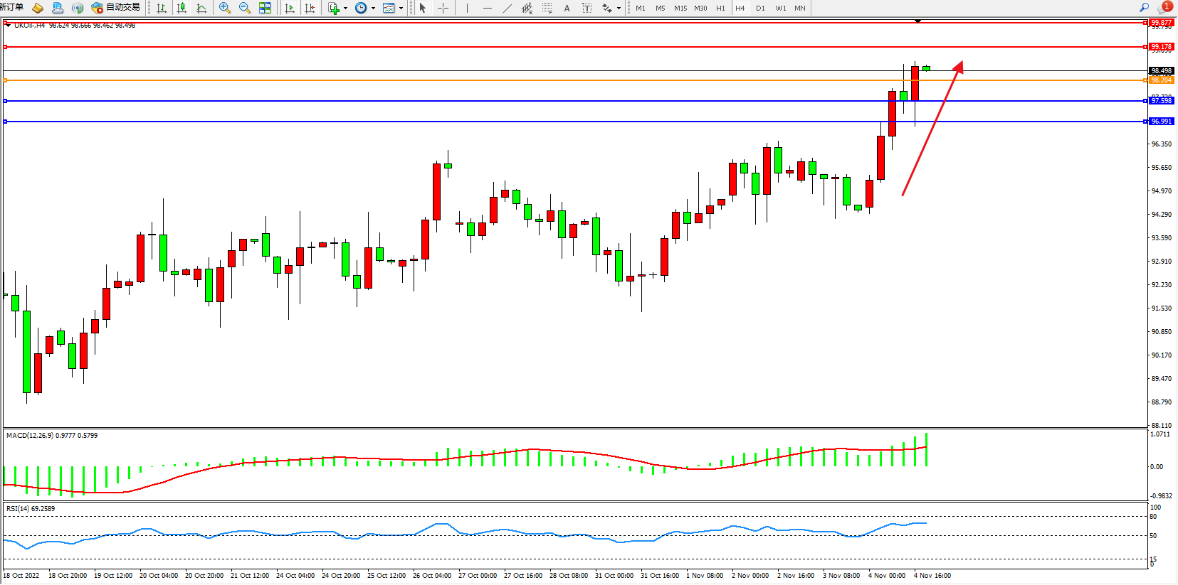 4小时图看:多头动力高位整理后急速拉升上扬,短期看涨情绪涌现,市场多头有继续上移迹象,MACD指标处于多头区域不断上移,RSI指标处于50均衡线上側持续整理;