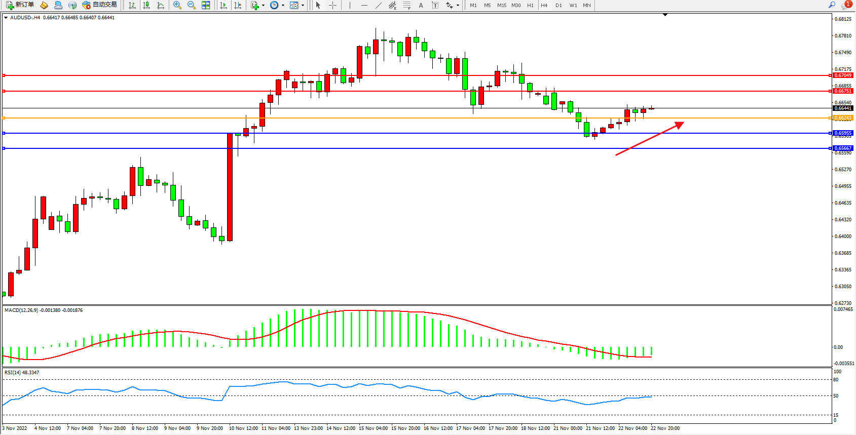 4小时图看:多头动力维持整理上移,短期看涨情绪涌现,市场多头动力缓慢入场,MACD指标处于空头区域整理,RSI指标弱势上移至0轴线附近弱势整理;