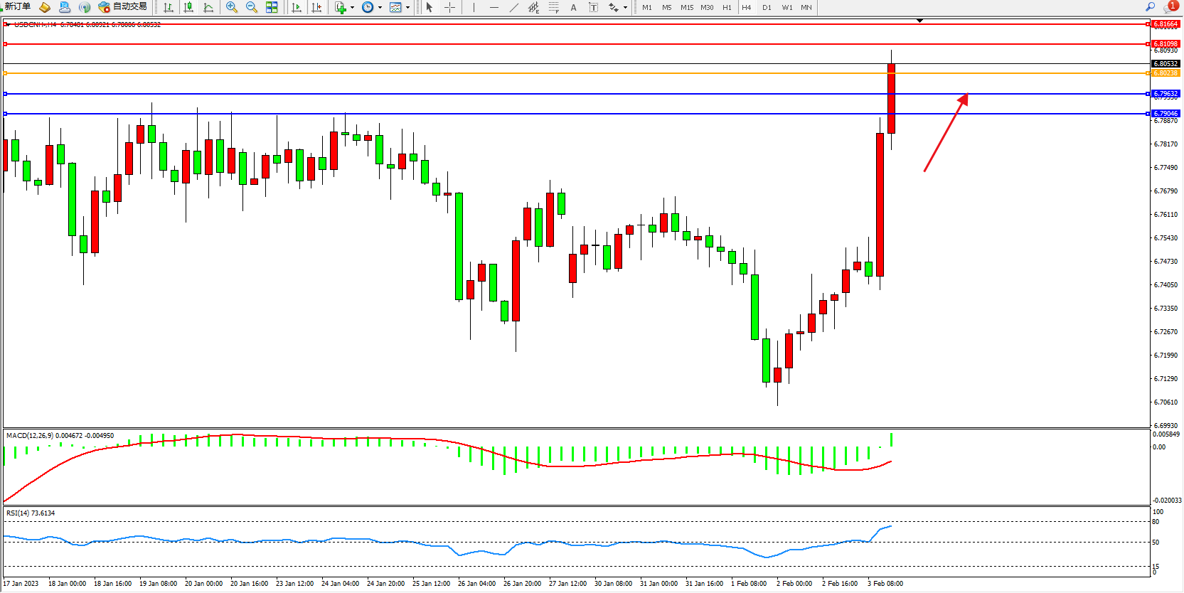 交易策略:6.80238上方看涨,目标6.81098、6.81664